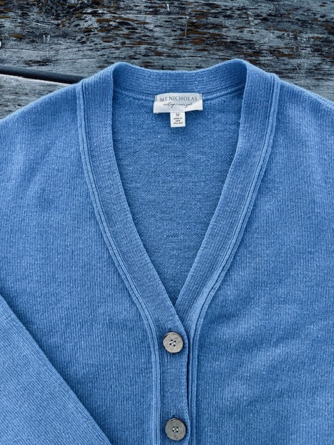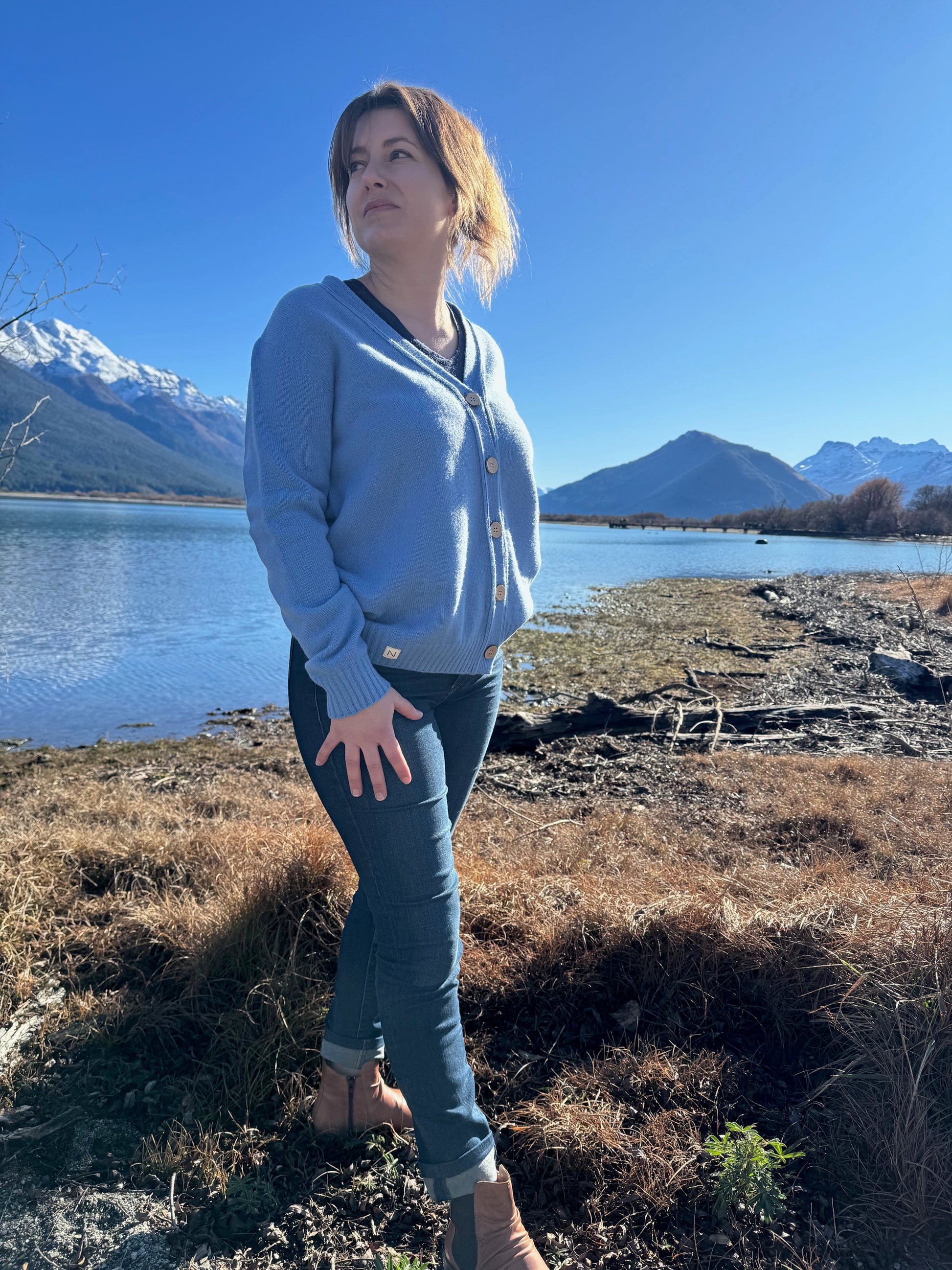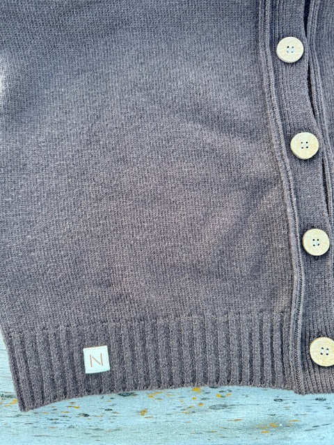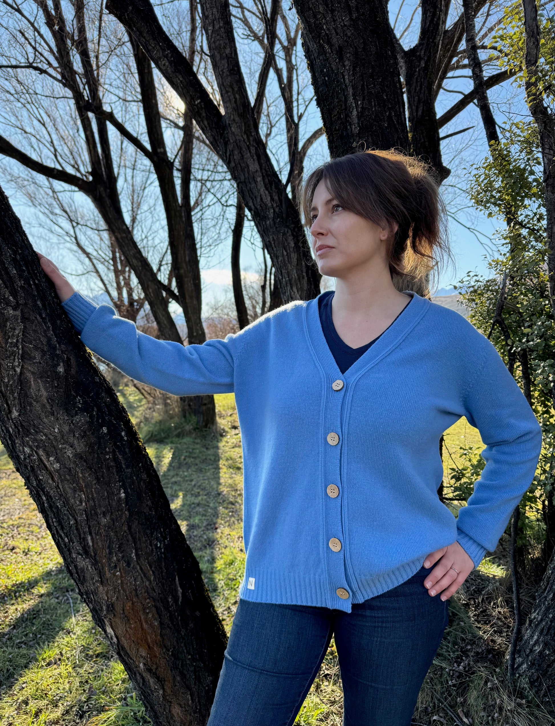 A relaxed fit Cardi, size down for a closer fit. Mid-length, finishing just below the hip. This cardi fits loosely through the mid section and tapers in at the hips. Features five Eco-friendly coconut buttons.